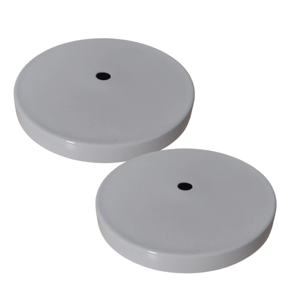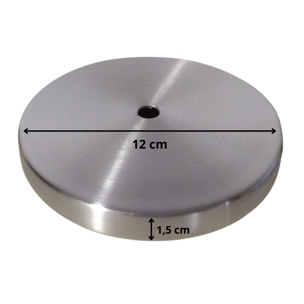 Canopla fabricada em alumínio com acabamento escovado ou pintura eletrostática Acabamento de teto/parede para luminárias Diâmetro de 12 cm Altura 1,5 cm Furo M-10 Pacote com 2 unidades
