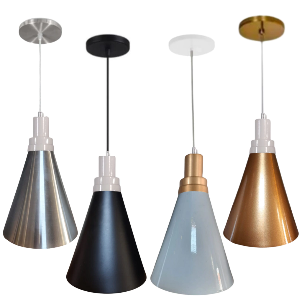 Pendente em Alumínio com Pintura Eletrostática, Marca Deltalux, Cúpula e Acabamento de teto em Alumínio (não enferruja), composta por Cabo PP: 1,0 mt com tamanho ajustável, Acabamento de teto Com 12 cm De Diâmetro, soquete E-27, Voltagem: 127/220v Bivolt Soquete: E-27. Não Acompanha Lâmpada. Dimensões cúpula superior: alt. 7,5 diâmetro 5,5 cm Dimensões total: Altura: 26cm, Diâmetro: 12 cm. Ideal para bancadas, ambientes como cozinha, área gourmet, sala de jantar, bares, etc...